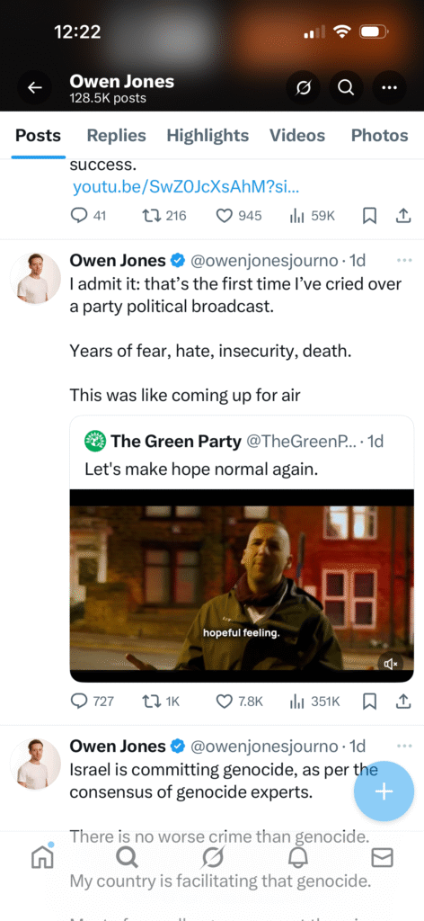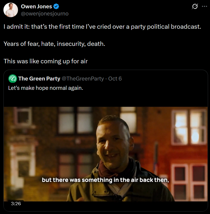 People didn’t just share it – they said it made them cry. They said it made them feel hopeful again. Owen Jones wrote that it hit him in the gut. Others said it was the first time in years that a piece of political communication had felt human.